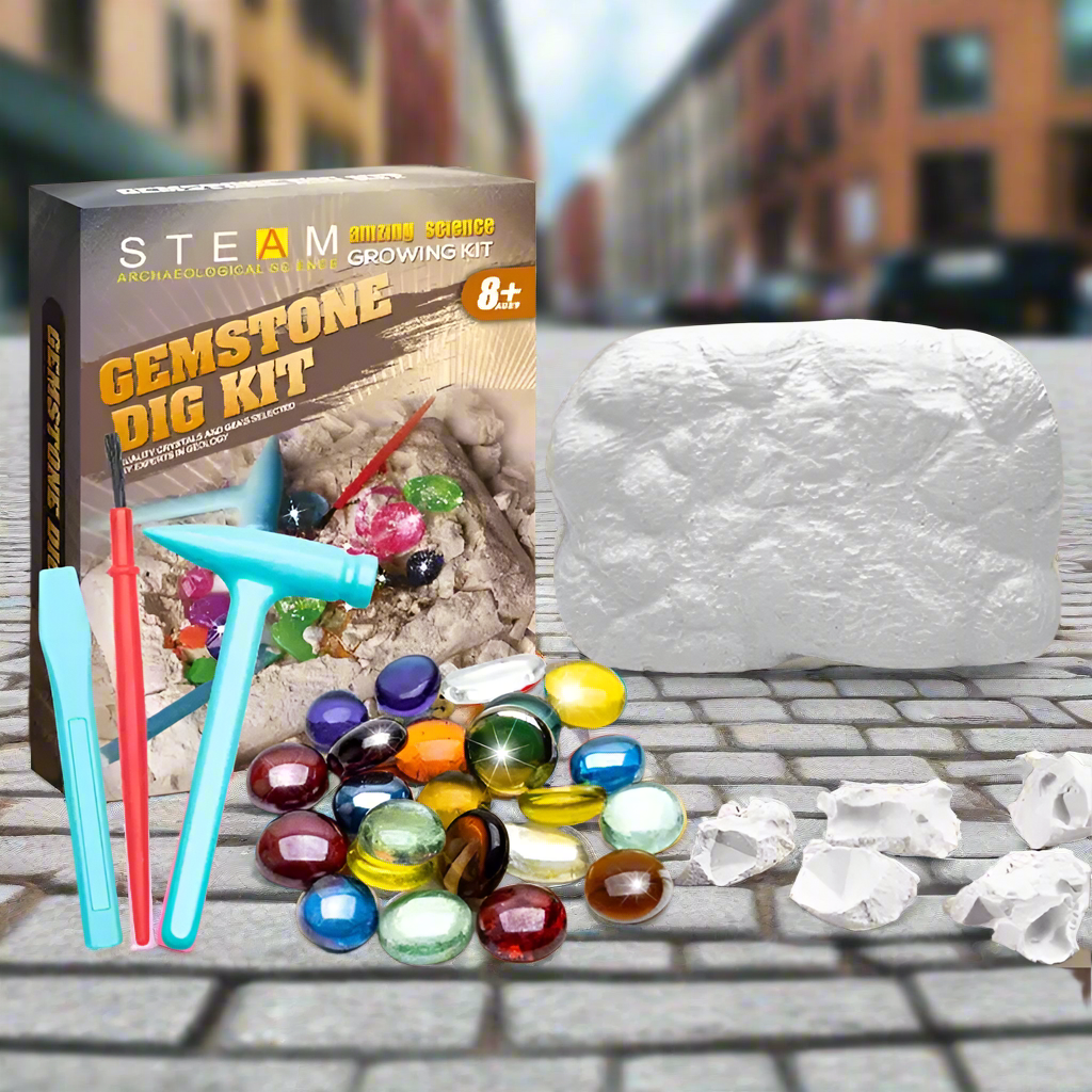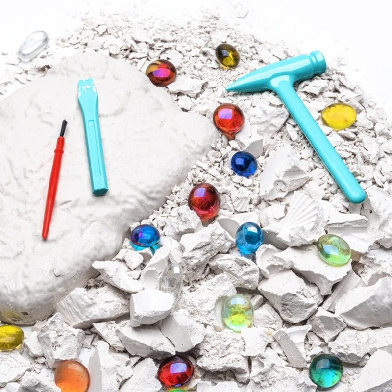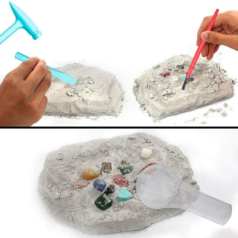 Es enthält Edelsteine, Fossilien sowie realistische Werkzeuge wie einen Mini-Hammer, eine Spitzhacke und eine Bürste für echten Ausgrabungsspaß.