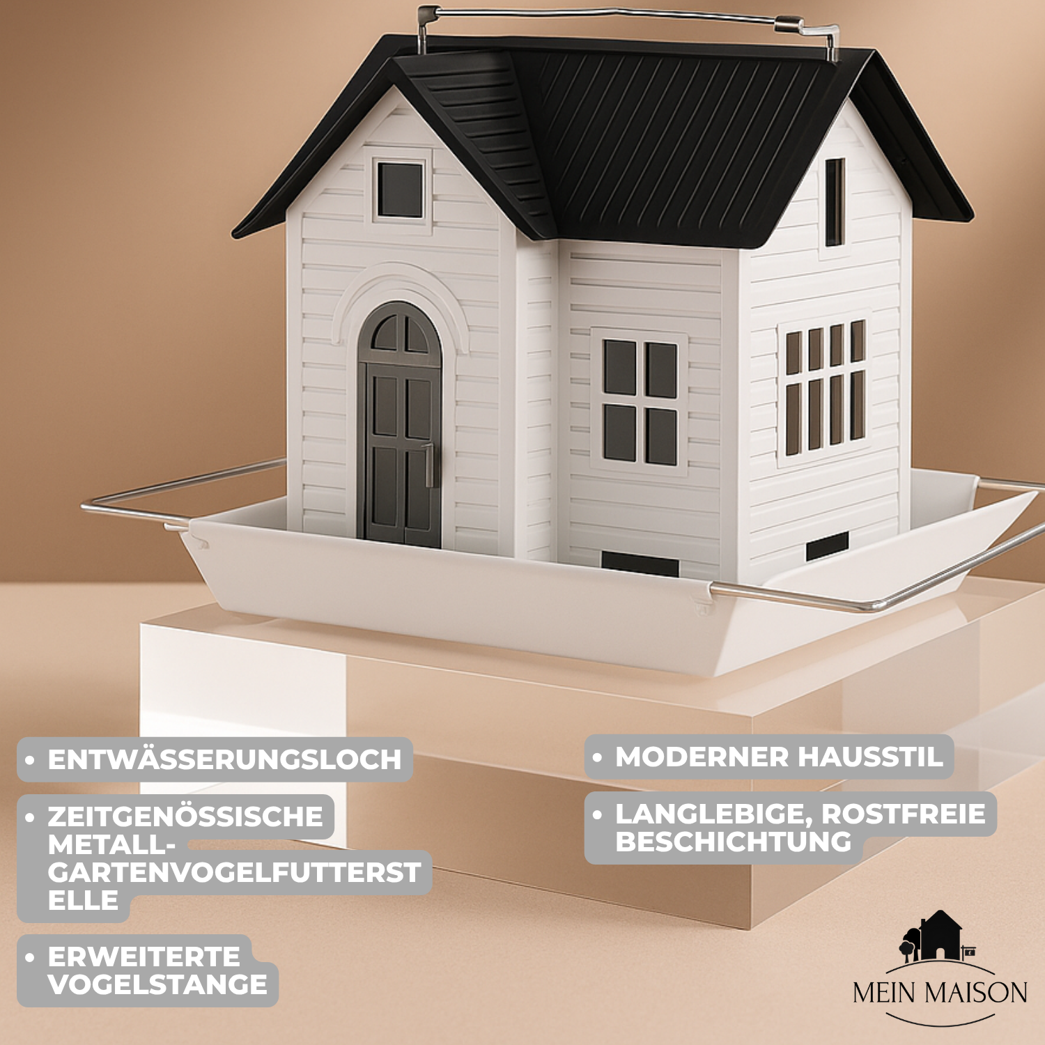 ✔️ Praktisch & pflegeleicht: Durch kleine Wasserabflüsse im Boden wird Staunässe verhindert, so bleibt das Futter trocken, hygienisch und frisch. Die verlängerte Sitzstange bietet Platz für mehrere Vögel gleichzeitig.