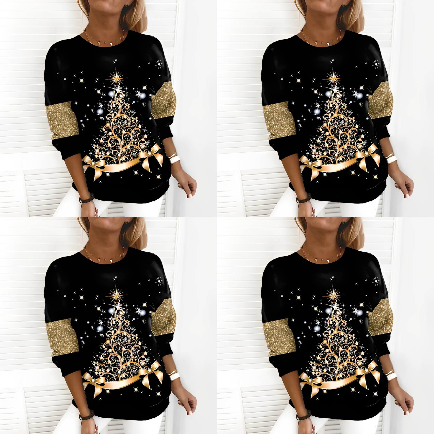 Die Sophia begeistert mit einem prächtigen, funkelnden Weihnachtsmotiv, kombiniert mit glitzernden Akzenten an den Ärmeln, die einen eleganten und zugleich spielerischen Festtags-Look kreieren. Der weiche Stoff bietet angenehmen Tragekomfort, während der lässige Schnitt ideal für kuschelige Wintermomente ist – perfekt für Weihnachtsfeiern, Familienabende oder gemütliche Adventslooks.